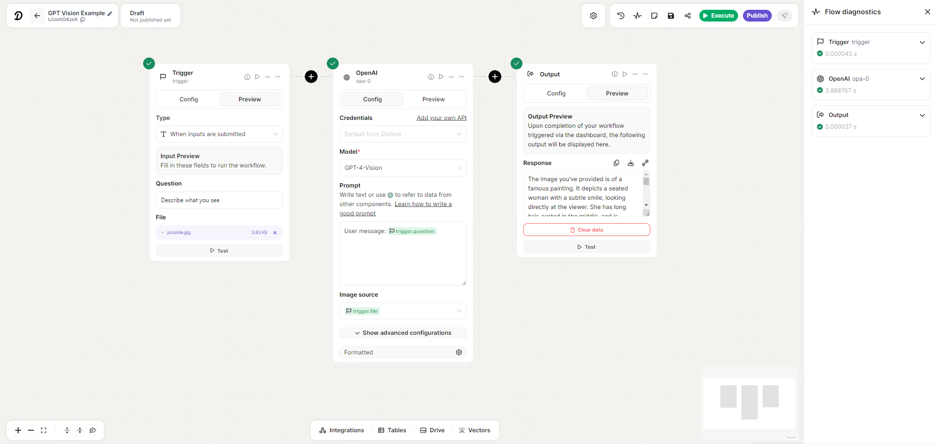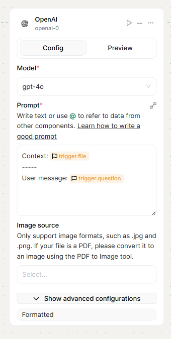 The OpenAI component allows you to integrate OpenAI GPT-4 Vision into your flows. In particular, the following versions are supported: