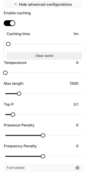 | Frequency penalty | <p>This parameter helps control the repetitiveness of the generated text. A higher value for the Frequency Penalty encourages the model to generate more diverse and varied responses by penalizing the repetition of similar phrases or words. Conversely, a lower value allows for more repetitive output. It's a useful tool for fine-tuning the balance between coherence and diversity in the generated text.<br><em>Valid range for this parameter is -2 to +2.</em></p> |