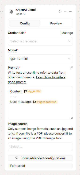 | Credentials    | You can specify to use your own OpenAI credentials                                                                                                                                                 |