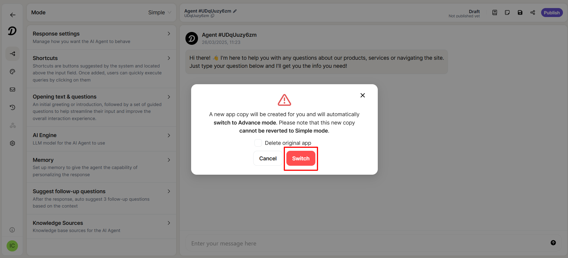 Step 1: At "setting AI chat & Agent page", switch mode from "Simple" to "Advanced"
