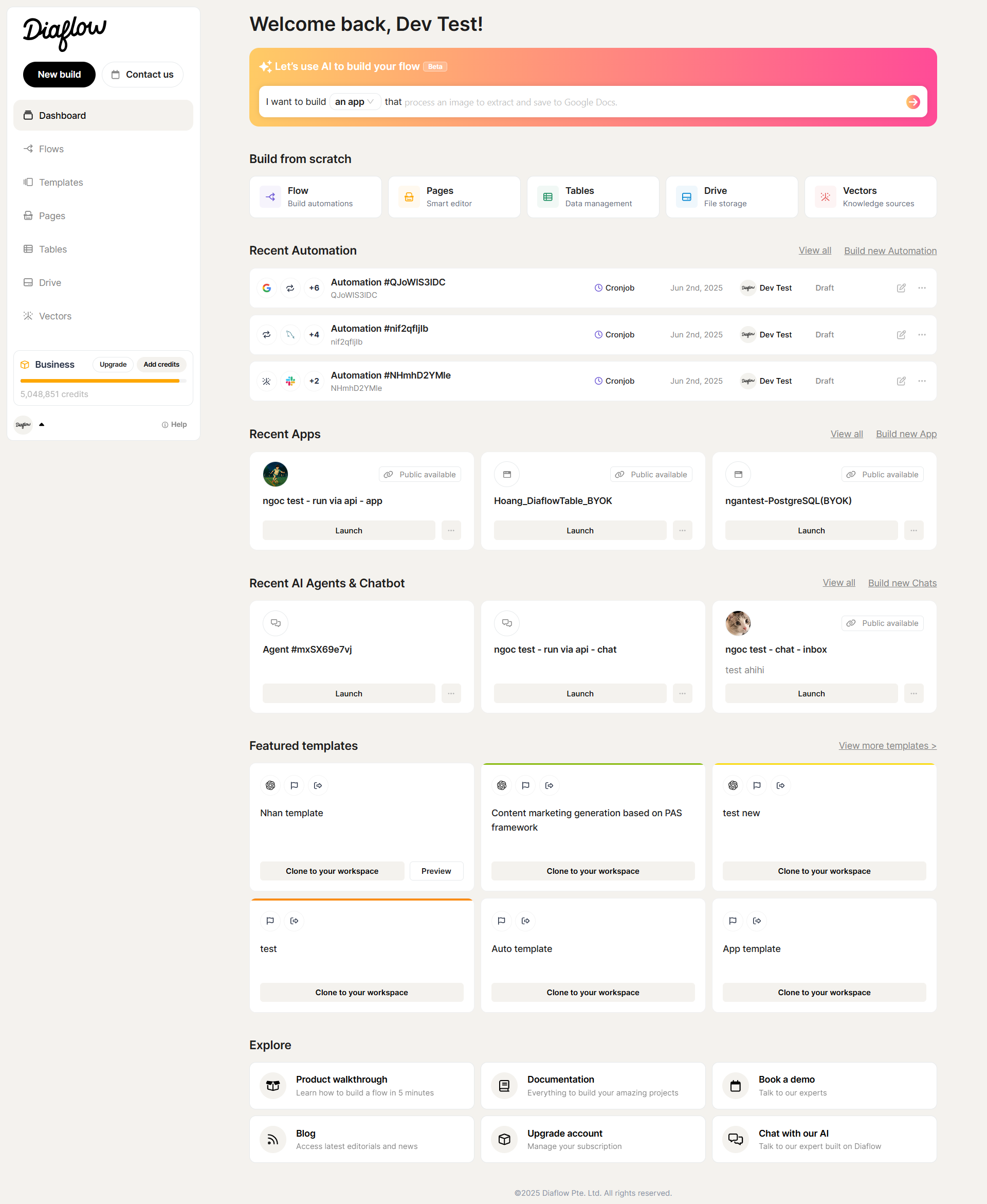 The dashboard home page provides quick access to recent flows and featured flow templates. The home page can be accessed by selecting "**Dashboard**" from the sidebar menu. You can also enter your desired task into the search box, and browse through the Diaflow provided built-in solutions.