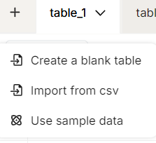 The screen below appears when you click the arrow to the right of your table name. It provides options to create a table using a CSV file, add a row, and export tables as CSV files. Additionally, you can rename, duplicate, or delete your table.